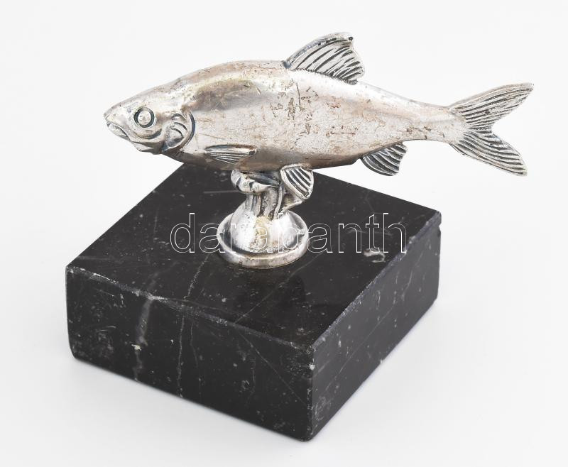 Ezüstözött ponty szobor márvány talapzaton, kopással, m: 9 cm