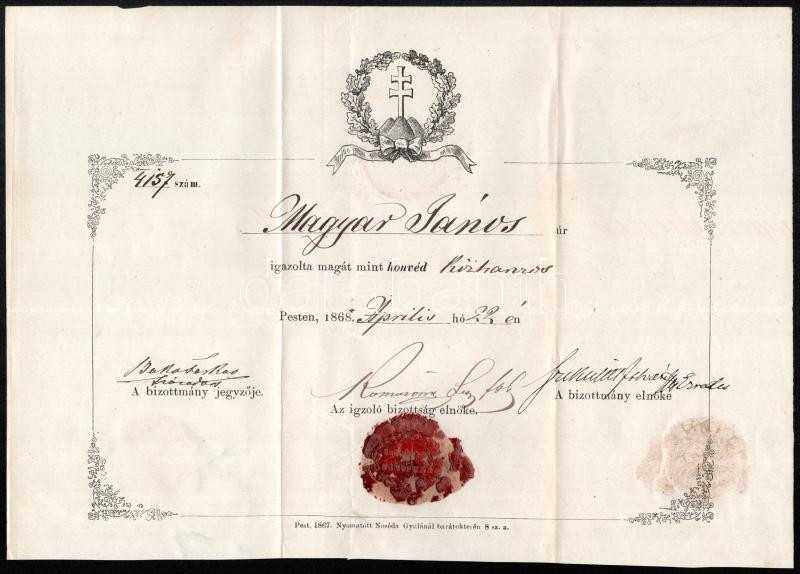 1868 A Honvéd Igazoló Bizottság igazolása honvéd közharcos számára. Az...
