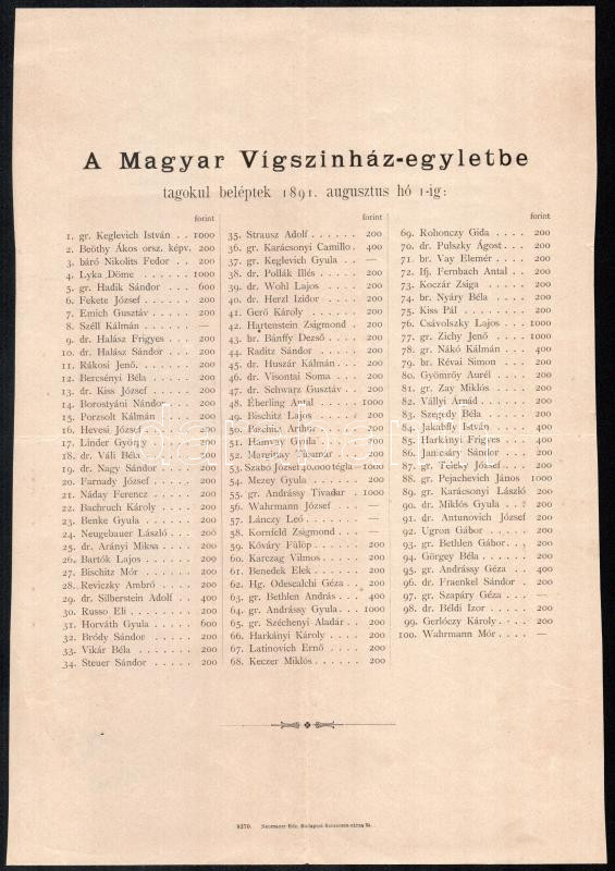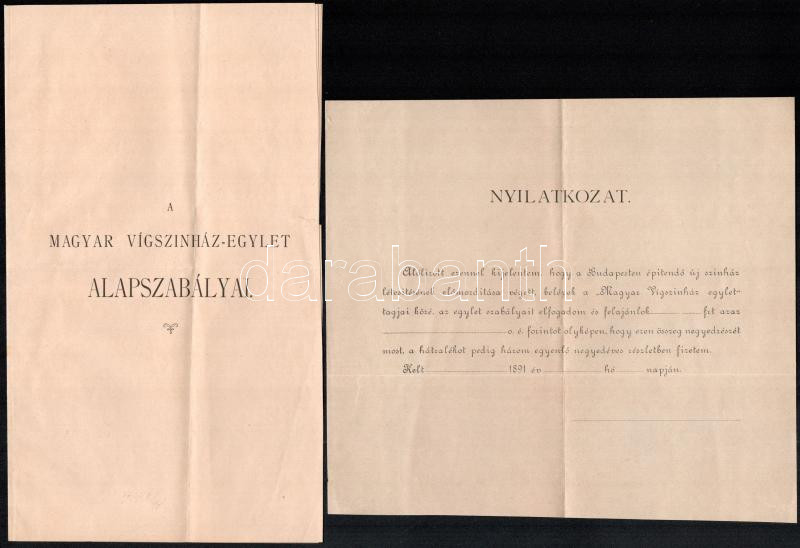 1891 A Magyar Vígszínház Egylet alapszabályai. 4p. + A Magyar Vígszínház egyletbe belépett tagok 1891 augusztus hó 1-ig. Nyomtatvány, Andrássy,.Pulszky, Rákosi, stb nevekkel. + belépési nyilatkozat.