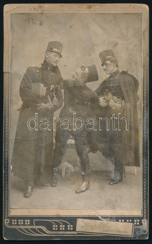 1908 Mókázó katonák hegedűvel és cigarettával, keményhátú fotó Nemes Pál székesfehérvári műterméből, foltos, 21,5×13,5 cm