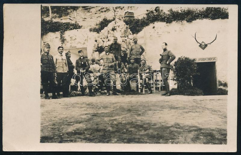 1917.VI.5. Magyar katonák "Zlj. [zászlóalj] parancsnokság" bejárata előtt a fronton, I. világháborús fotólap, 14x8,5 cm