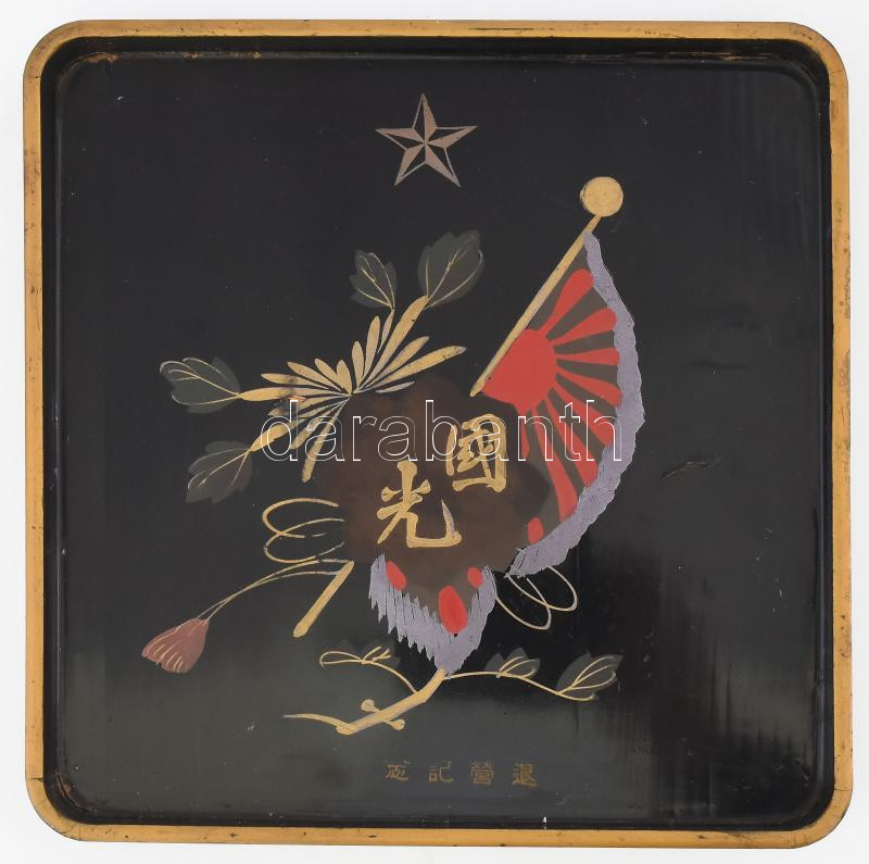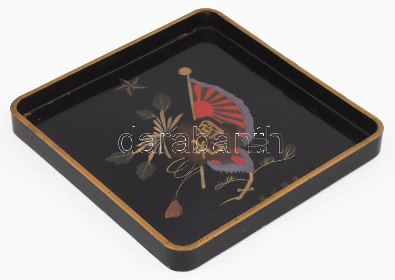 Description: Japán porcelán katonai lakkozott tálca. cca 1940-1944, a második világháborús Japán klasszikus szimbólumaival díszítve, némi elválással, kis kopással, 23x23 cm