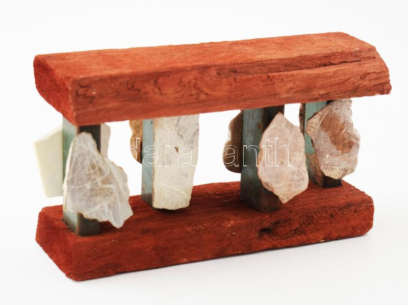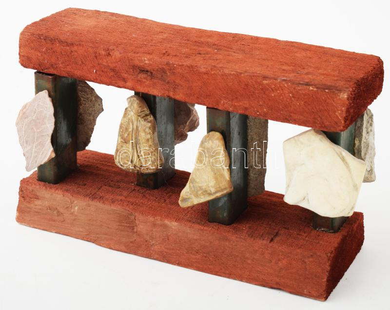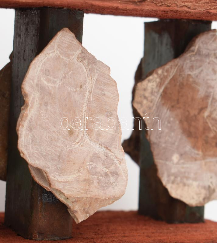 Nagy Sándor (1923-2017): Idolok. Faragott és vésett kő, fa és vas applikációban, jelzés nélkül, egy laza darabbal, 29x17 cm