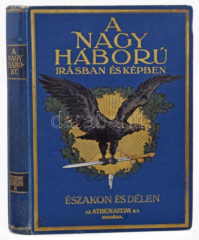 A Nagy Háború Ãrásban és képben. ElsÅ‘ rész: Északon és délen. II. köt. Szerk.: Landor Tivadar. Bevezetéssel ellátta: báró Hazai Samu. Bp., 1916, Athenaeum. RendkÃvül gazdag szövegközi és egészoldalas képanyaggal illusztrálva. Kiadói aranyozott, illusztrált egészvászon-kötés, kissé sérült gerinccel, helyenként kissé sérült lapszélekkel, néhány kijáró lappal.