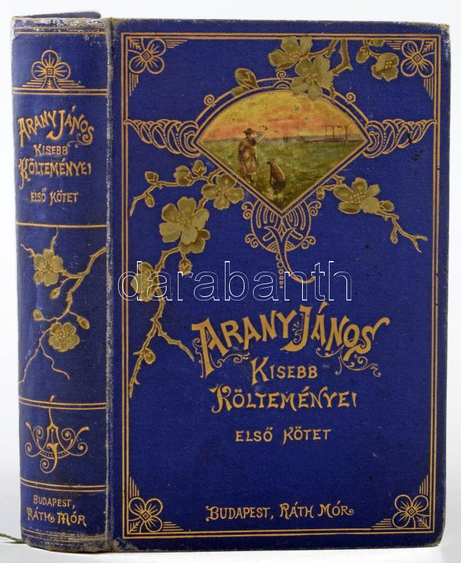Arany János kisebb költeményei. Teljes gyűjtemény. I. köt. Bp., 1894, Ráth Mór, XVI+357 p. Kiadói dúsan aranyozott, festett, illusztrált kék egészvászon sorozatkötés, aranyozott lapélekkel, kopott borítóval, ajándékozási sorokkal, az elülső szennylapon szakadással.