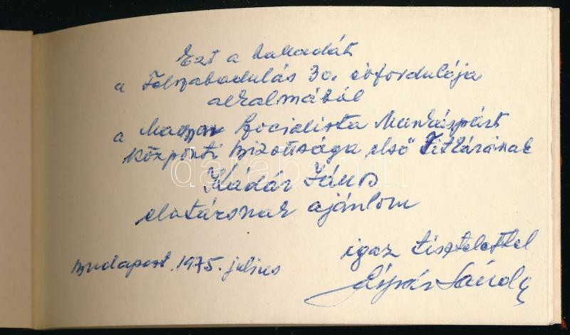https://www.darabanth.com/en/479-Online-auction/479.0/Books/Books-Other-rarities~1000037/Gaspar-Sandor-Dani-Kadar-Janosnak-DEDIKALT-Hn-1975-Vaszonkotesben-jo-allapotban~II3270670