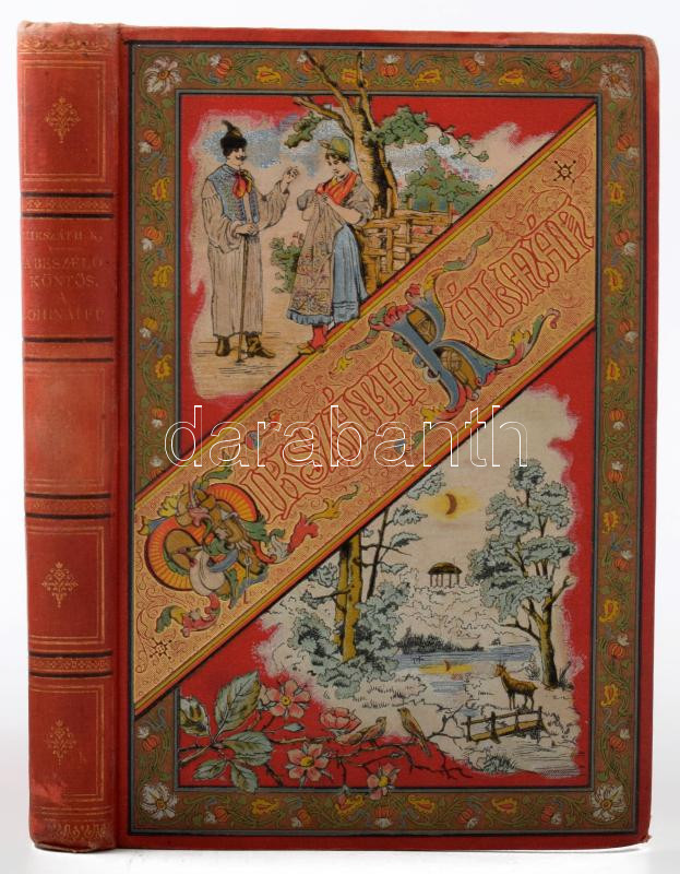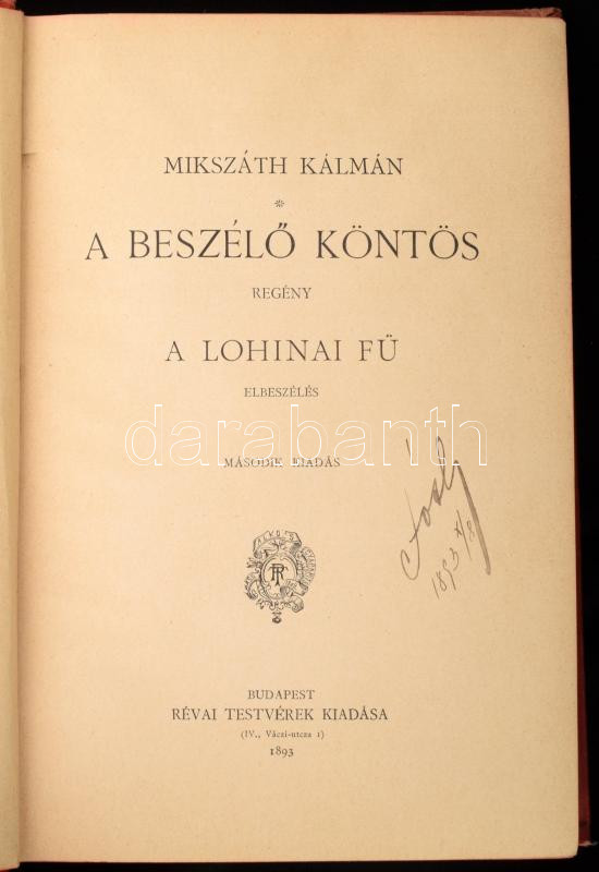 Mikszáth Kálmán: A beszélő köntös. A lohinai fű. Mikszáth Kálmán Munkái. Bp., 1893, Révai, 3 sztl. lev.+214+2 p. Második kiadás. Kiadói dekoratív, aranyozott, illusztrált egészvászon sorozatkötés, Gottermayer-kötés, festett lapélekkel, kopott, foltos borítóval, foltos lapokkal, egy lapon szakadással.