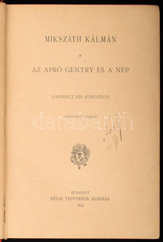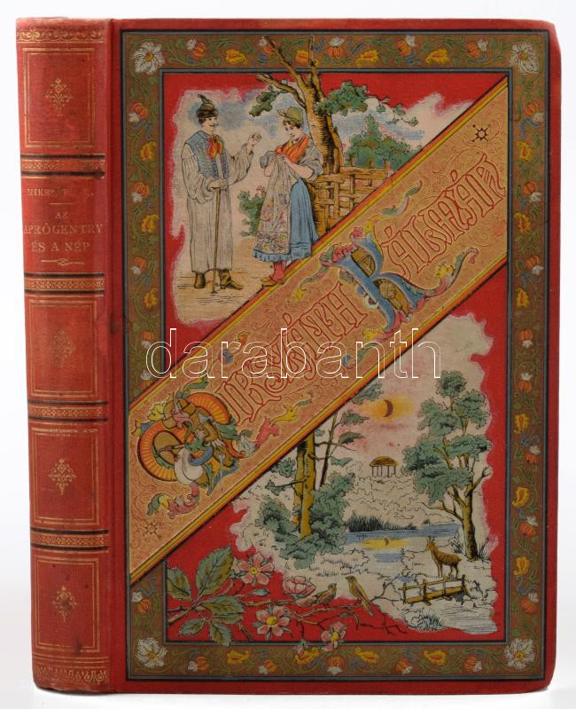 Mikszáth Kálmán: Az apró gentry és a nép. Harmincz kis elbeszélés. Mikszáth Kálmán munkái. Bp., 1893, VIII+243 p. Harmadik kiadás. Kiadói dekoratív, aranyozott, illusztrált egészvászon sorozatkötés, Gottermayer-kötés, festett lapélekkel, kopott, foltos borítóval, foltos szennylapokkal.