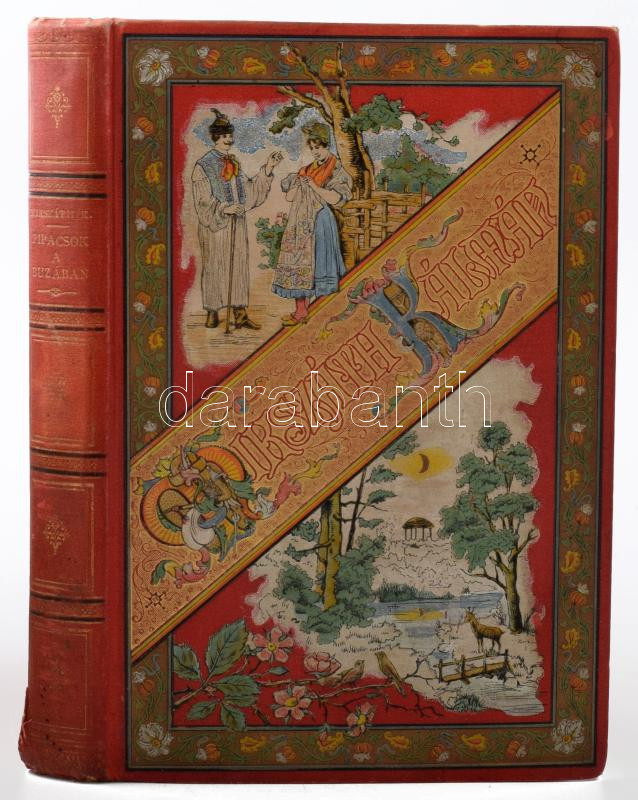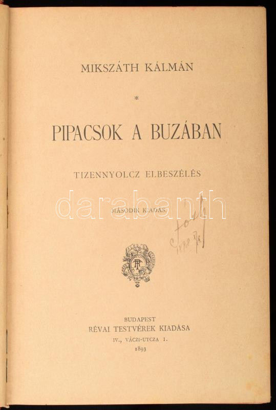 Mikszáth Kálmán: Pipacsok a búzában. Tizennyolcz elbeszélés. Mikszáth Kálmán munkái. Bp., 1893, Révai, 3 sztl. lev.+230+2 p. Második kiadás. Kiadói dekoratív, aranyozott, illusztrált egészvászon sorozatkötés, Gottermayer-kötés, festett lapélekkel, kopott, foltos borítóval, és néhány foltos lappal, egy lapon bejelöléssel, névbejegyzéssel.
