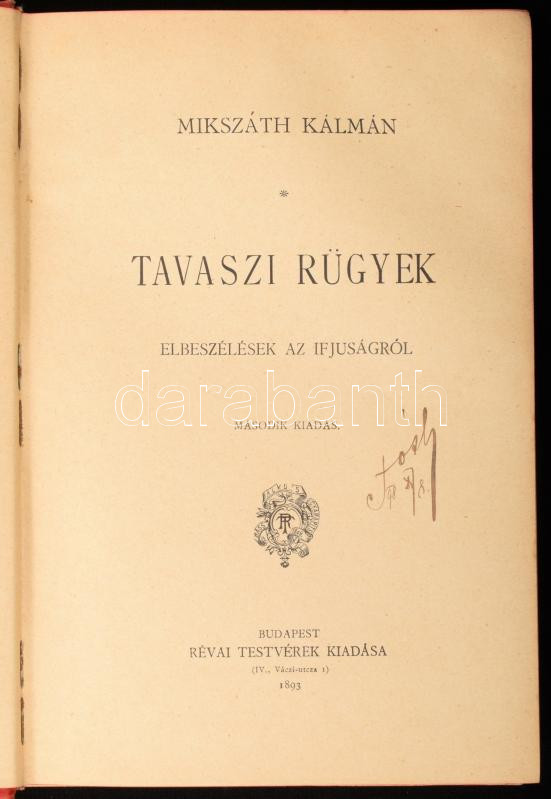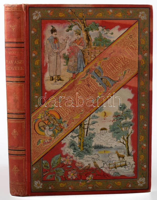 Mikszáth Kálmán: Tavaszi rügyek. Elbeszélések az ifjúságról. Mikszáth Kálmán Munkái 5. köt. Bp., 1893, Révai, 4 sztl. lev.+ 218+(2) p. Második kiadás. Kiadói dekoratív, aranyozott, illusztrált egészvászon sorozatkötés, Gottermayer-kötés, festett lapélekkel, kopott, foltos borítóval, az utolsó két lap kijár, foltos lapokkal.