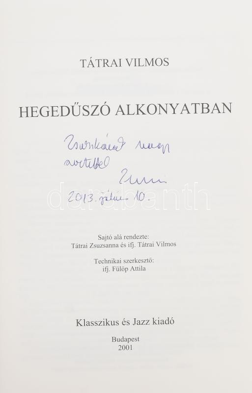 Tátrai Vilmos: Hegedűszó alkonyatban. Tátrai Vilmos lánya, Tátrai Zsuzsanna (1945?) magyar néprajzkutató, a néprajztudomány kandidátusa, a Magyar Tudományos Akadémia Bölcsészettudományi Kutatóközpont Néprajztudományi Intézete Folklór Témacsoportjának tudományos főmunkatársa, a kötet szerkesztője által DEDIKÁLT példány! Bp., 2001, Klasszikus Jazz Kiadó. Kiadói kartonált kötés, papír védőborítóval, jó állapotban.