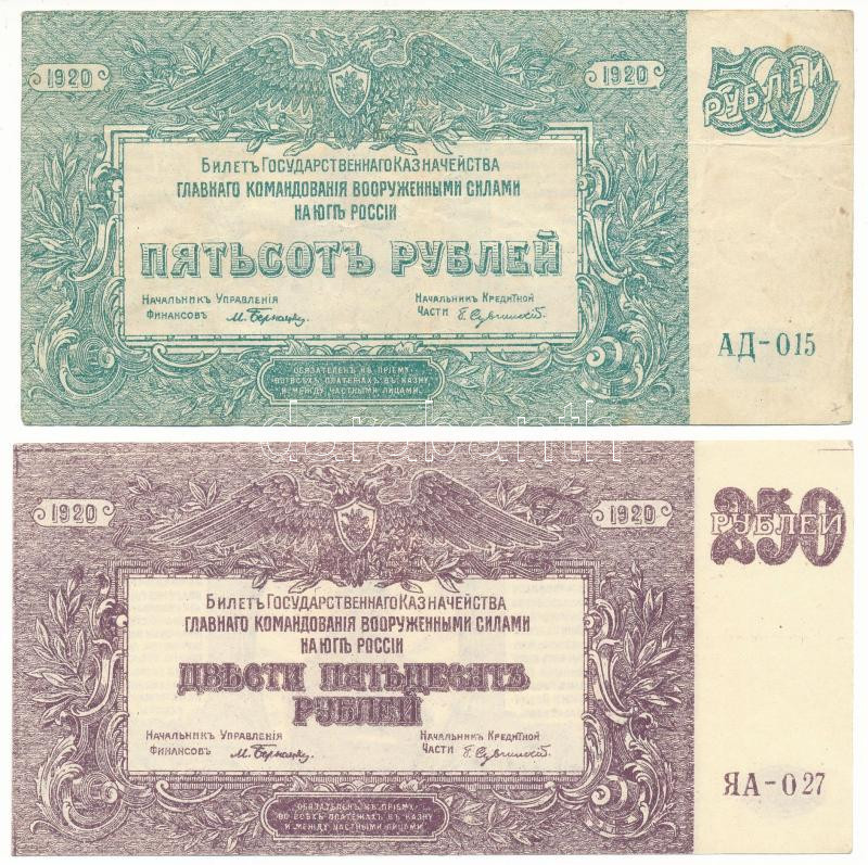 Orosz Polgárháború / Dél-Oroszország / Wrangel Hadserege 1920. 250R + ... https://www.darabanth.com/en/479-Online-auction/479.0/Numismatics/Worldwide-banknotes~1500015/Orosz-Polgarhaboru-Del-Oroszorszag-Wrangel-Hadserege-1920-250R-plus-500R-T-VF-F-tulyukakRussian~II3264479