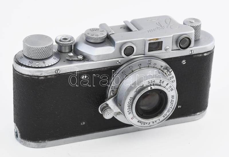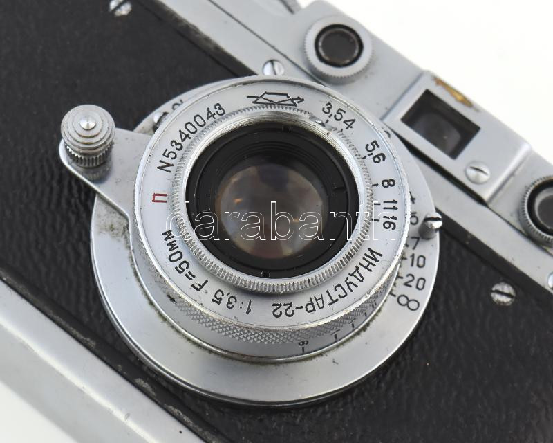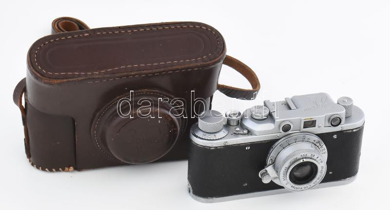Zorkij szovjet távmérős fényképezőgép, Industar-22 50mm f/3.5 objektívvel, sapkával, eredeti bőr tokjában / Vintage USSR rangefinder camera, in original leather case