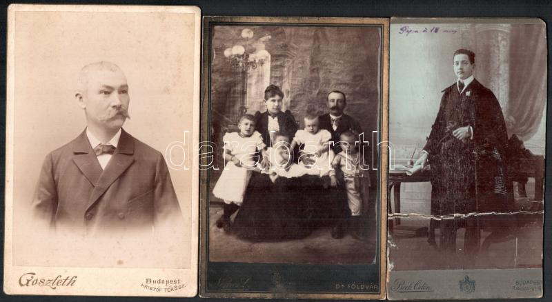 cca 1900 össz 3 db portré, keményhátú fotó Klf, műtermekből (Beck Ödön/Bp., Nemes Lajos/Dunaföldvár, Goszleth/Bp.), Beck Ödön sérült, 13x18 cm