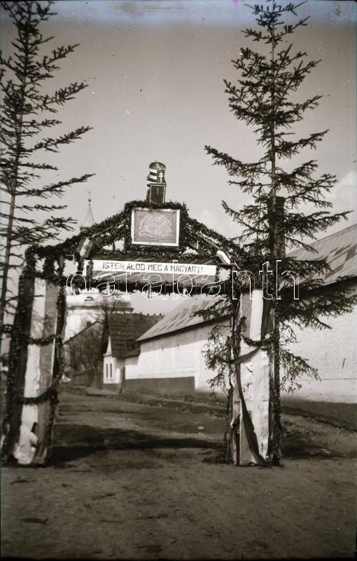 cca 1938-1940 Bevonulás alkalmából készített díszkapu, fotónegatív, 9×6 cm