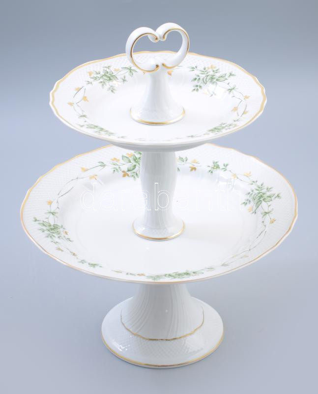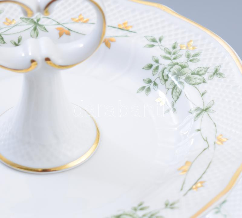Description: Hollóházi Erika mintás emeletes kínáló. Jelzéssel, hibátlan, d: 26 cm, m: 32 cm, fogója lejár /// "Erika a Classic család legismertebb és legkedveltebb díszítése zöld tónusú, apró virágmintákkal és 21 karátos, kézzel festett arany kiegészítésekkel."