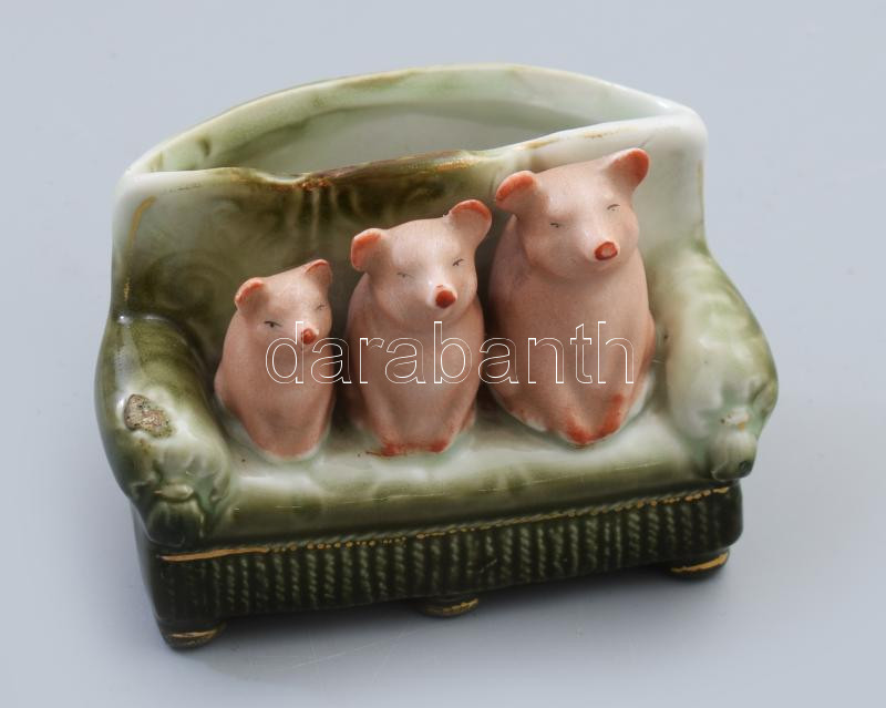 Malacok a kanapén antik német szerencsehozó kisváza, jelzett, kopással, 9,5x7 cm