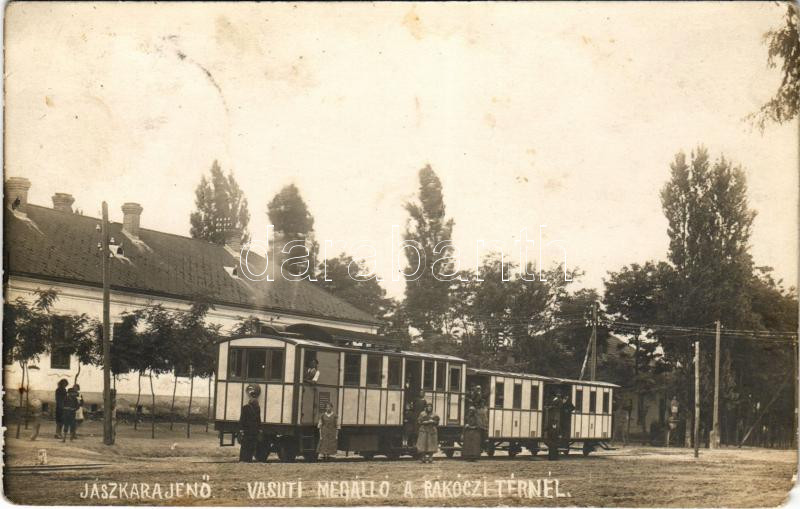 1927 Jászkarajenő, Rákóczi téri (később Templom tér) vasúti megálló a kisvasúttal, vasútállomás, vonat. photo (EM)