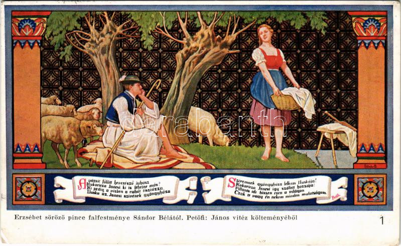 1928 Budapest V. Egyetem utca 5. Erzsébet Királyné Szálló étterem és söröző pince, Sándor Béla falfestménye Petőfi Sándor János vitézéből (EK)