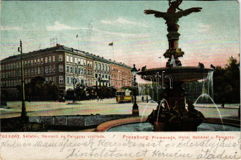 1907 Pozsony, Pressburg, Bratislava; Sétatér, Nemzeti és Palugyay szálloda, villamos, szökőkút. Kaufmann's "Bediene dich allein" / Promenade, Hotel National u. Palugyay / promenade, hotels, tram, fountain (EM)