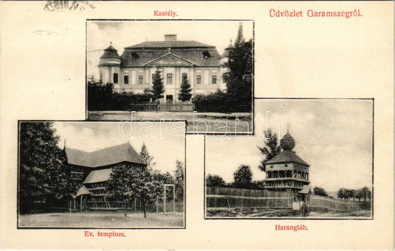1908 Garamszeg, Garansek, Hronsek (Besztercebánya, Banská Bystrica); Soós-Géczy kastély, Evangélikus fatemplom, harangláb. Paulinyi Dániel kiadása / castle, Lutheran wooden church, belfry