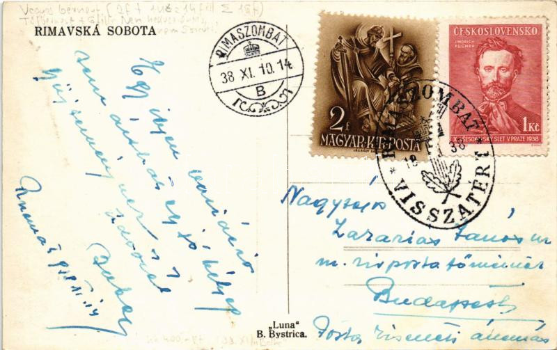 1938 Rimaszombat, Rimavska Sobota; Egyesült protestáns főgimnázium / school + "1938 Rimaszombat visszatért" So. Stpl (gyűrődés / crease)