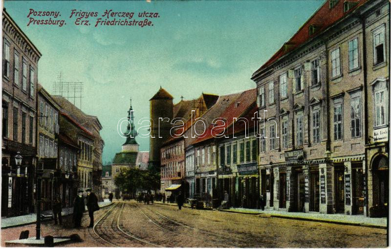 Pozsony, Pressburg, Bratislava; Frigyes herceg utca, üzletek / street,...