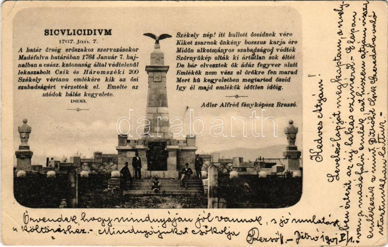 https://www.darabanth.com/en/479-Online-auction/479.0/Postcards/Transylvania~2000006/1901-Madefalva-Csikmadefalva-Siculeni-A-madefalvi-veszedelem-1764-turul-emlekoszlopa-Ad~II3268227