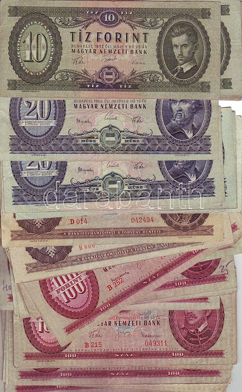 52 db magyar bankjegy 1949-1992. 10Ft, 1957. 10Ft (2x) T:II-,III+, 1960. 10Ft (4x) T:III+, 1962. 20Ft (3x) T:T:II/III+, 1965. 20Ft (4x) T:II/III+, 1965. 50Ft (1x) T:II, 1980. 50Ft "H" sorszámmal (1x) T:II R!, 1949. 100Ft (7x) T:II/III, 1957. 100Ft (4x) T:II/III,III, 1960. 100Ft (11x) T:II/III,III, 1962. 100Ft (12x) T:II,II/III, 1968. 100Ft (2x) T:II,II/III, 1992. 100Ft (1x) T:II