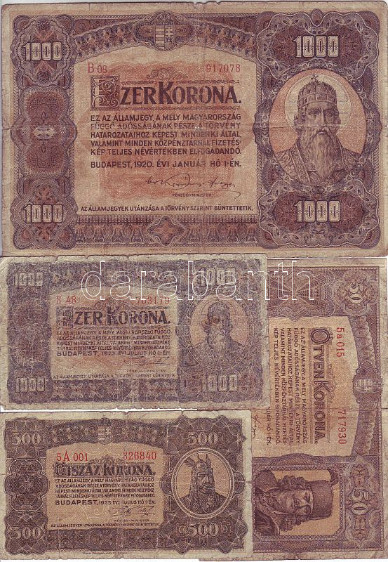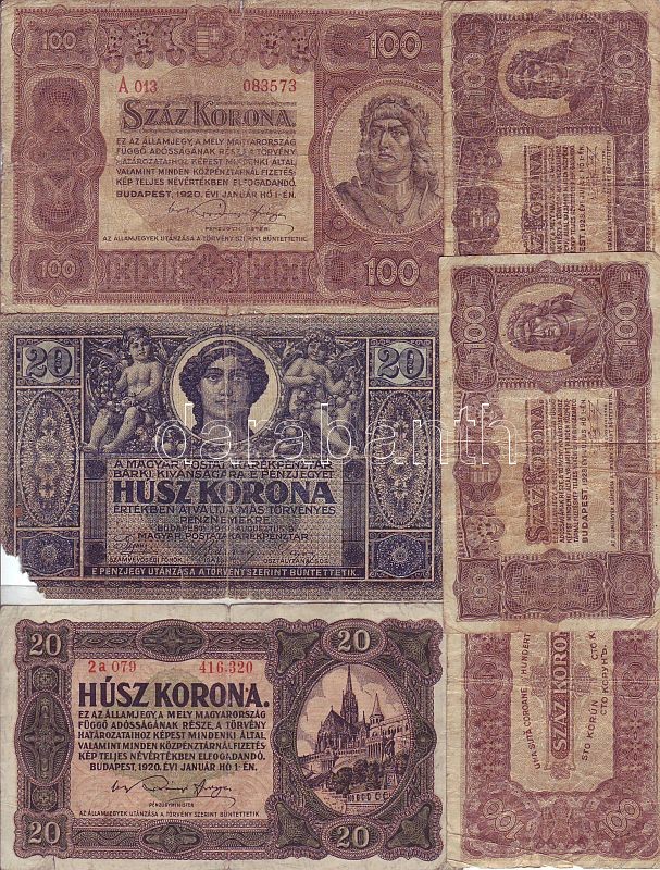 Kis korona tétel 1919.VIII.9 20K (1x) T:IV, 1920. 20K (1x) a sorszám számjegyei közt pont van! T:III/IV, 1920. 50K (1x) T:III/IV, 1920. 100K (1x) T:III/IV, 1923. 100K (3x) T:III,III/IV, 1923. 500K "Magyar Pénzjegynyomda Rt" (1x) T:III/IV, 1920. 1000K (1x) T:III/IV, 1923. 1000K (1x) T:IV