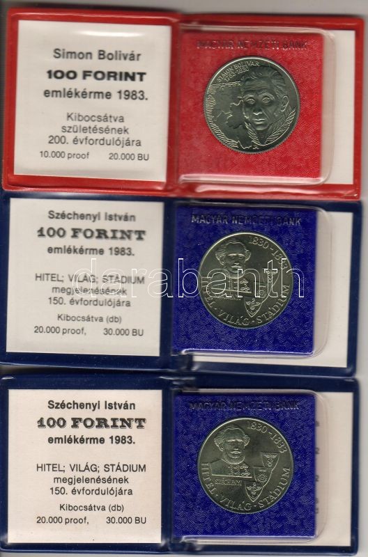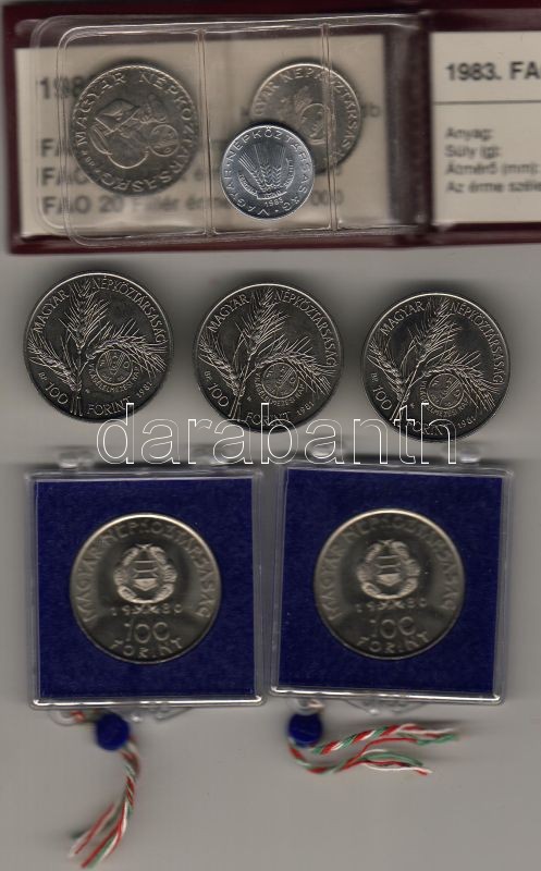 1980. 100Ft "Űrrepülés" (2x) + 1981. 100Ft "Világélelmezés" (3x) + 1982. 100Ft "Labdarúgó VB" (3x) + 1983. 20f + 5Ft + 10Ft + 100Ft "FAO" sor + 1983. 100Ft "Széchenyi" (2x) + 1983. 100Ft "Bolivar" összesen 15db T:BU többségében eredeti csomagolásban