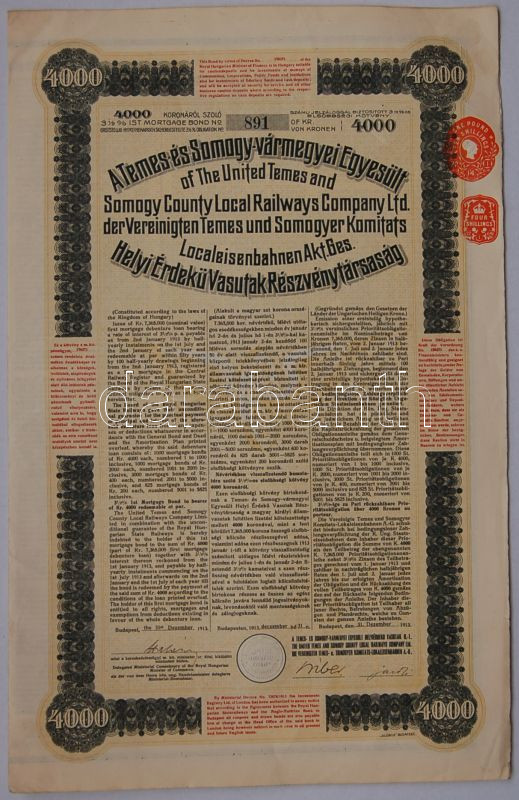 https://www.darabanth.com/en/48-Online-auction/48.0/Numismatics/~142/1913-Temes-es-Somogy-varmegyei-Egyesult-Helyi-Erdeku-Vasutak-Rt-4000-K-kotveny-Vereignte-L~II67722