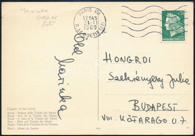 1969 Dallos Marinka festőművész által aláírt képeslap