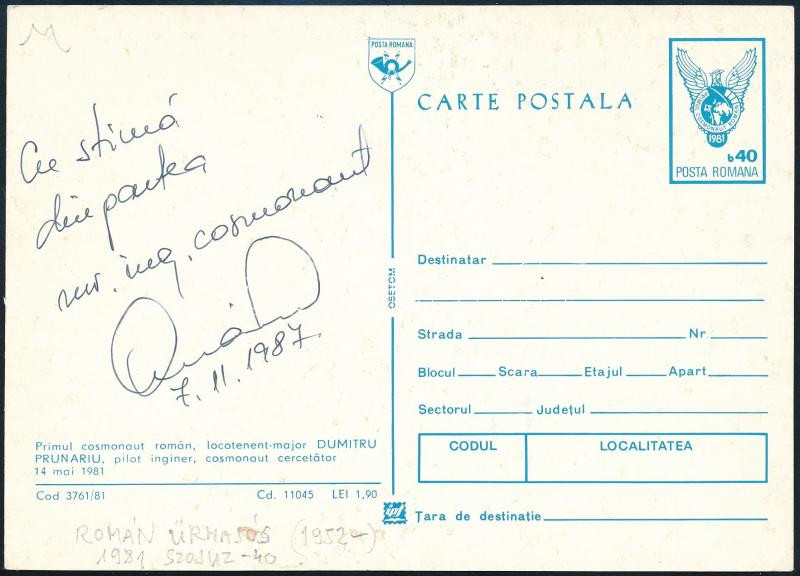 Dumitru Prunariu (1952-) román űrhajós aláírása az őt ábrázoló képeslap hátoldalán
