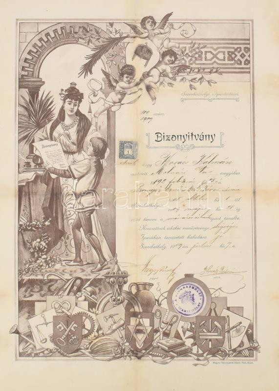 1909 Szombathely, a Szombathelyi Ipartestület által kiállított bizonyí... https://www.darabanth.com/en/480-Online-auction/480.0/Art-and-other-collectibles/Documents~500020/1909-Szombathely-a-Szombathelyi-Ipartestulet-altal-kiallitott-bizonyitvany-meszaros-es-hentes~II3281232