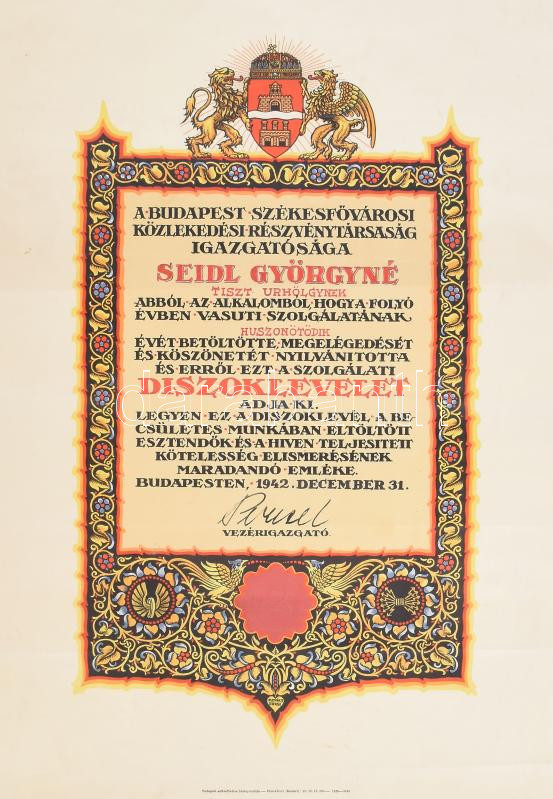 Description: 1942 Budapest Székesfővárosi Közlekedési Részvénytársaság (BSZKRT) igazgatósága 25 éves vasúti szolgálatért adományozott díszoklevele, dekoratív grafikával (szign.: Kovács Erzsi), hajtásnyomokkal, kisebb gyűrődésekkel, 50x35 cm