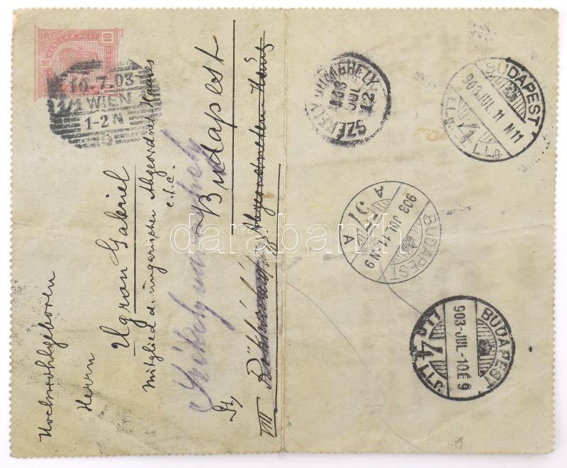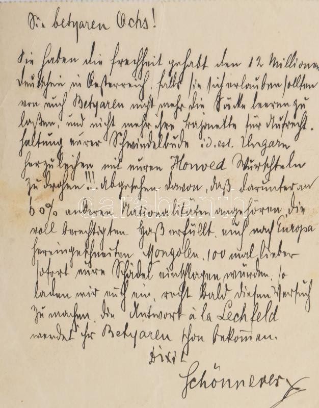 1903 Ugron Gábor (1847?1911) politikus, pártvezetÅ‘, országgyűlési képviselÅ‘nek küldött német ny. levél BécsbÅ‘l, "Sie betyaren Ochs!" (Ön betyár ökör!) megszólÃtással, közte emlÃtve honvéd és nemzetiség szavakat, feltehetÅ‘en brizáns politikai tartalommal, egy beÃrt oldal, Schönnerer aláÃrással