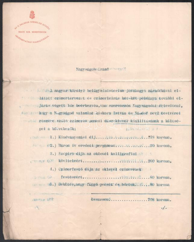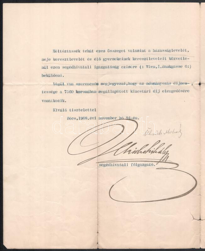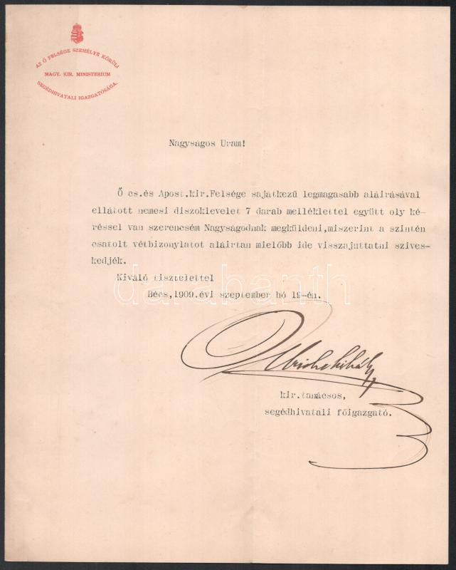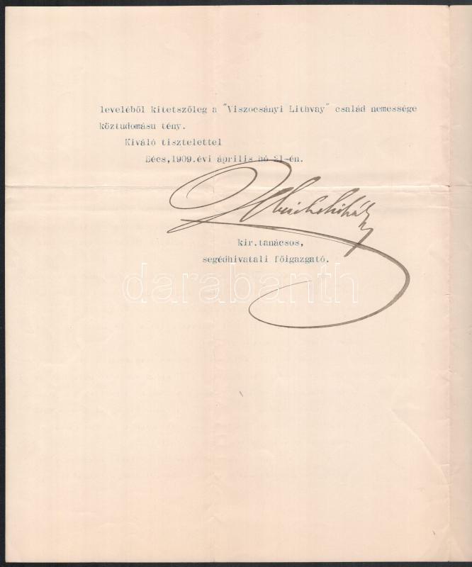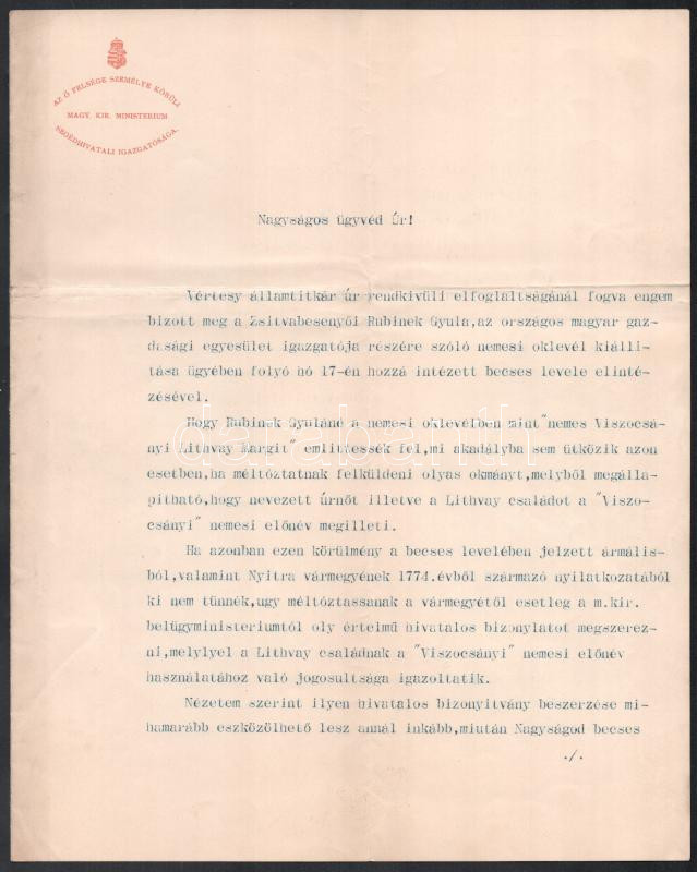 Description: 1908-1909 Rubinek Gyula (1865-1922) Országos Magyar Gazdasági Egyesület (OMGE) igazgatója, politikus, gazdasági író, későbbi földművelésügyi miniszter, és felesége, Rubinek Gyuláné Lithvay Margit (1870-1960) részére szóló iratok igazolandó nemesség ("Viszocsányi Lithvay") és nemesi díszoklevél ügyében. Segédhivatali főigazgató és belügyminisztériumi államtitkár aláírásaival, fejléces papírokon, 3+1 dokumentum.