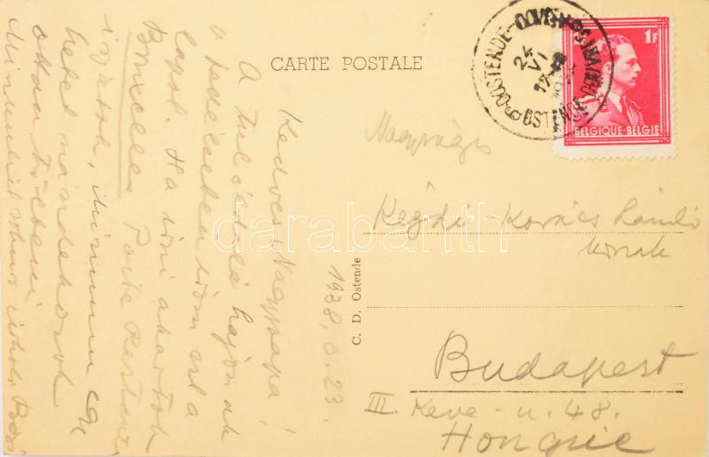 1938 Kézdi-Kovács Elemér (1898-1976) festőművész autográf sorai édesapjához, Kézdi-Kovács László (1864-1942) festőművész, műkritikushoz, Kézdi-Kovács Elemér autográf becenév (Bogi) aláírásával, oostendei képeslapon