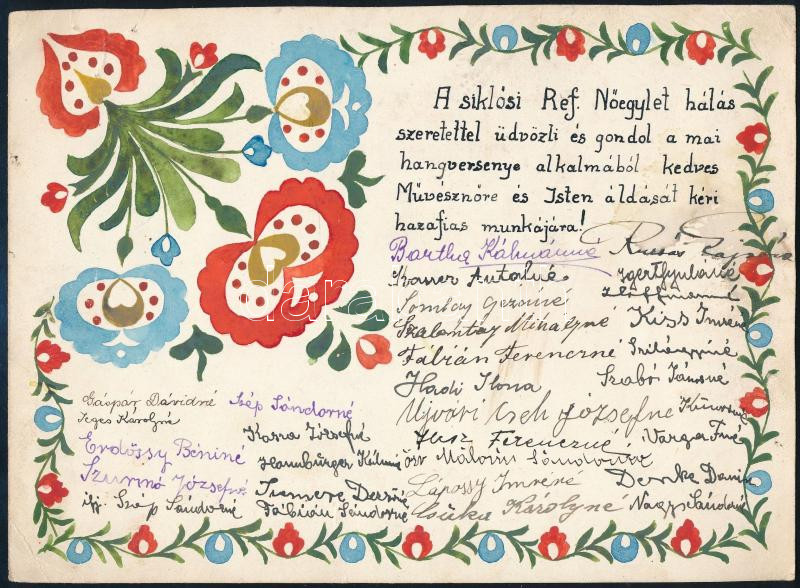 A siklósi Református Nőegylet kézzel festett köszönőlapja rengeteg alá...