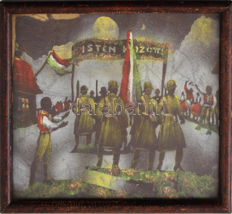 Description: cca 1938-1941 "Isten hozott!", irredenta festett szövetkép magyar katonákkal és bevonulási díszkapuval. Jelzés nélkül, kissé sérült, üvegezett fakeretben, 19,5x23,5 cm