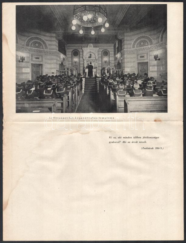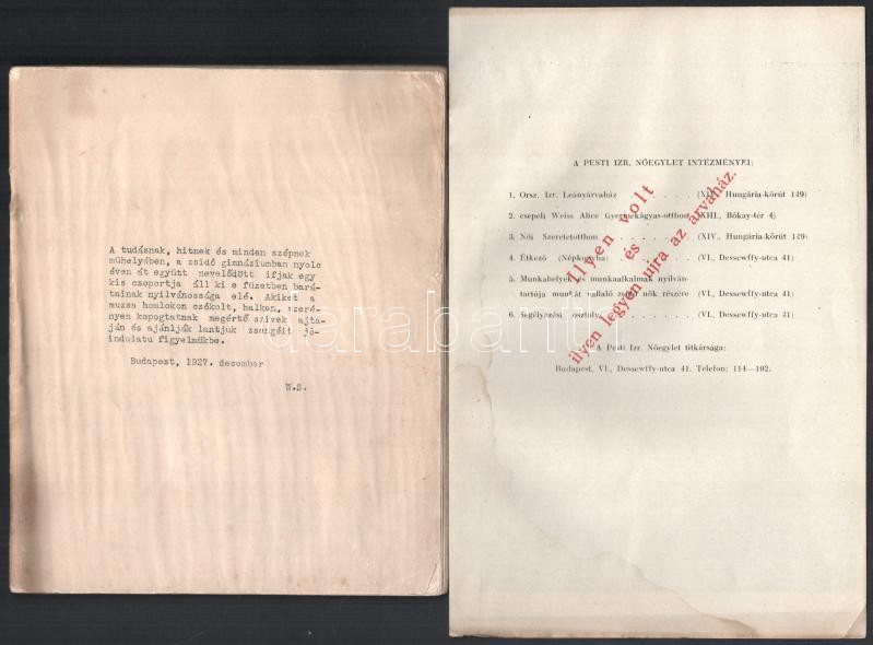 Description: 1927 Bp., zsidó gimnázium diákjai által összeállított versgyűjtemény, tűzött papírkötés, kissé viseltes, foltos + 1943 Az Országos Izraelita Leányárvaház templomát ábrázoló nyomtatvány, a Pesti Izr. Nőegylet intézményeinek felsorolásával, foltos