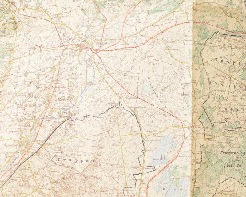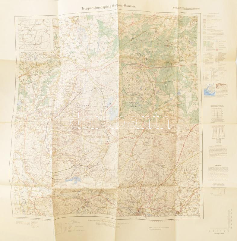 1943 Truppenübungsplatz Bergen, Munster. 1 : 1.000.000, Berlin, Reichsamt für Landesaufnahme, 72,5x69,5 cm. (Bergen katonai gyakorlótér térképe. A területen a Wehrmacht irányítása alatt 1935 és 1937 között épült ki a laktanyakomplexum és gyakorlótér; a komplexum a Bergenhez tartozó Belsen falu határában volt, ezért összevontan Bergen-Belsennek nevezték el. 1941-ben a katonai komplexum mellett hadifogolytábor létesült, amelynek egy része 1943-ben az SS felügyelete alatt koncentrációs táborrá lett alakítva.)