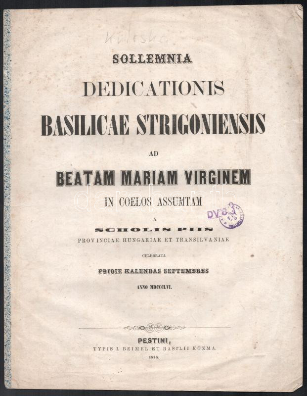 1856 Az Esztergomi Bazilika felszentelése alkalmából kiadott nyomtatvány]. Sollemnia dedicationis basilicae Strigoniensis ad Beatam Mariam Virginem in coelos assumtam a scholis piis provinciae Hungariae et Transilvaniae celebrata pridie kalendas Septembres anno MDCCCLVI. Pestini, 1856, Beimel és Kozma. 8p.