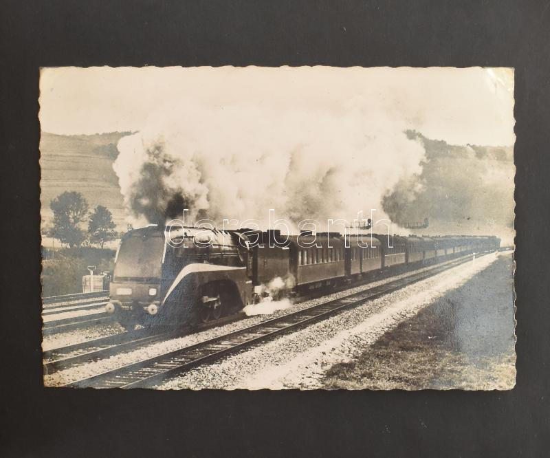 Description: 1947 Franciaország, cserkész jamboree albuma, felvarróval, képeslapokkal, cserkésztáborban készült fotókkal, az album második felében városképes fotókkal, mozdonyokról készült képekkel, vegyes méretben