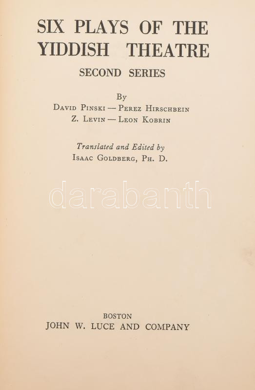 Description: David Pinski - Perez Hirschbein - Z. Levin - Leon Kobrin: Six plays of the jiddish theatre. Second series. Translated and edited by Isaac Goldberg. Boston, én.,John W. Luce. Angol nyelven. Félvászon-kötésben, kopott borítóval, ex libris-szel.