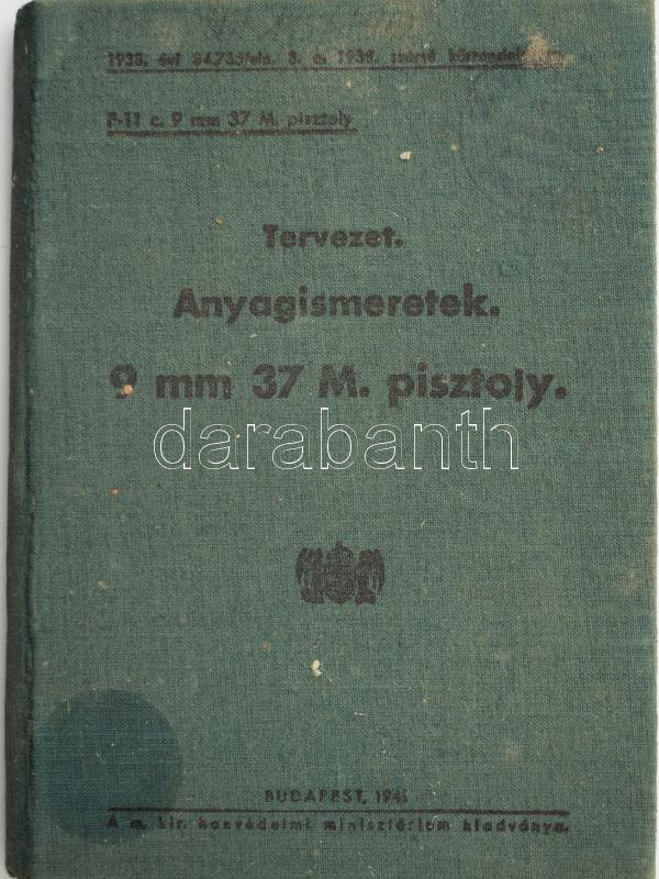 Tervezet. Anyagismeretek. 9 mm 37 M. pisztoly. Bp., 1941., M. Kir. Honvédelmi Minisztérium, (Athenaeum-ny.), 37 p.+VI t. Kiadói egészvászon-kötés, kissé kopott, kissé foltos borítóval, mellékletek nélkül, "M. Kir. 1. csendőr lovas ... osztály parancsnokság Kiskunhalas" bélyegzésekkel.