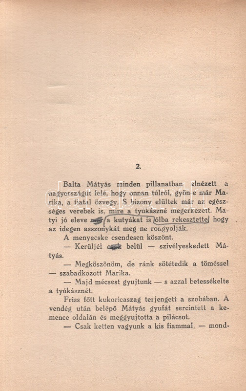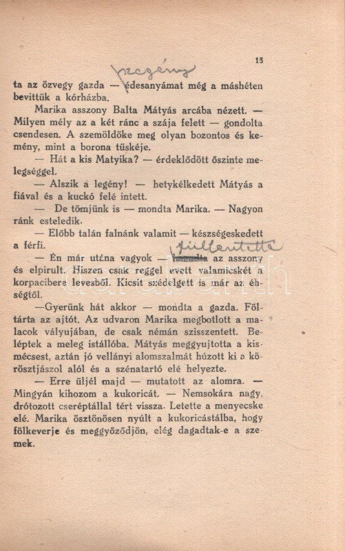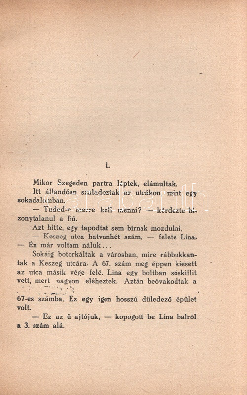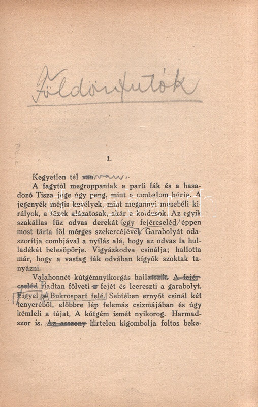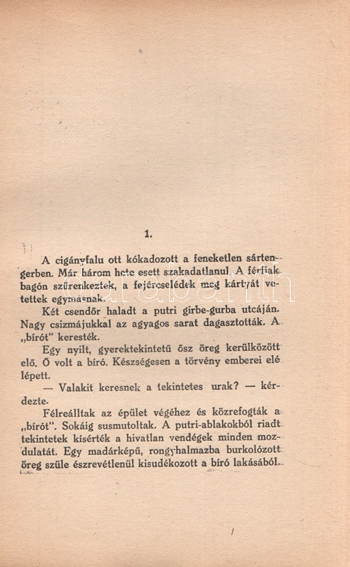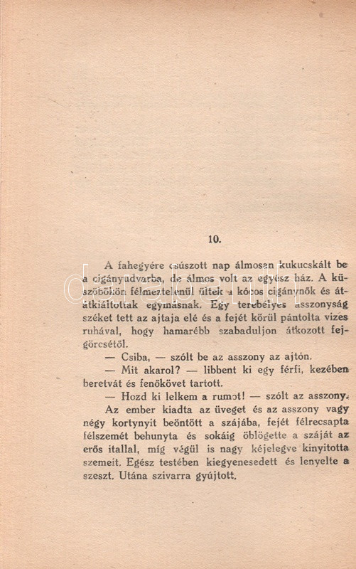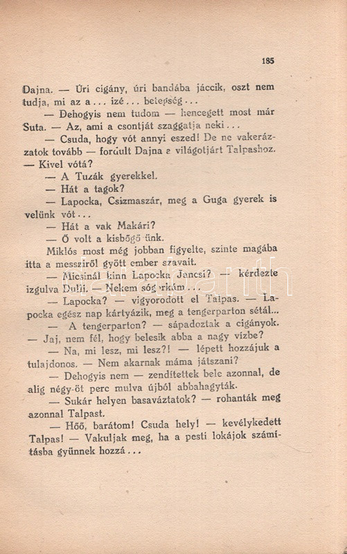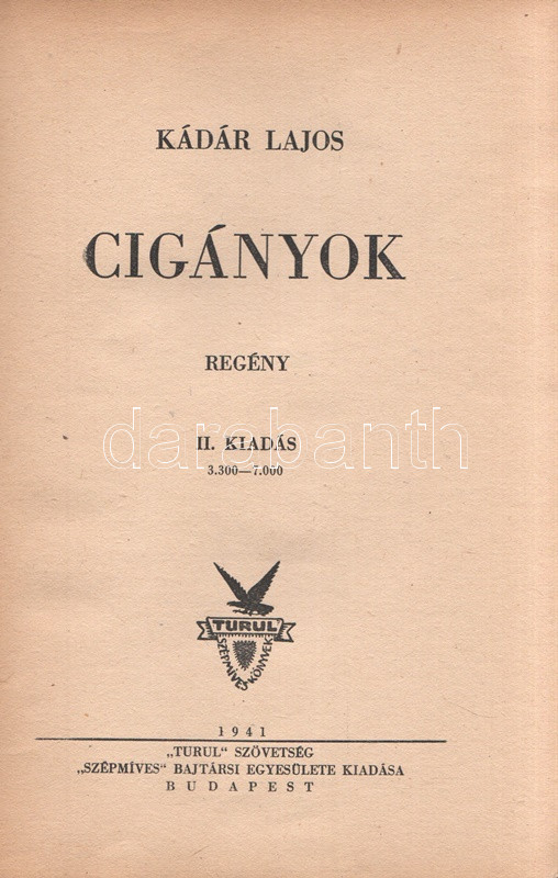 Kádár Lajos (1896-1986) író, Móricz Zsigmond felfedezettje. A cigányság körében játszódó művész regény első kiadása 1932-ben jelent meg, példányunk a második kiadásból való. Az első néhány ív oldalain a szerzőtől származó korrektúrázások és szövegjavítások. Az első előzéken Ex libris. Néhány oldal fűzése enyhén meglazult, néhány oldalon felül apró, a szövegtükröt nem érintő szakadásnyom.