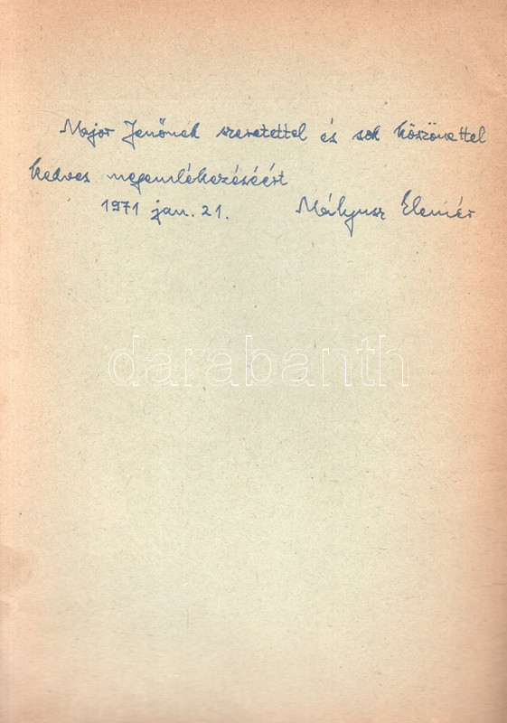 Dedikált: "Major Jenőnek szeretettel és sok köszönettel a kedves megemlékezéséért. Mályusz Elemér. 1971. jan. 21".