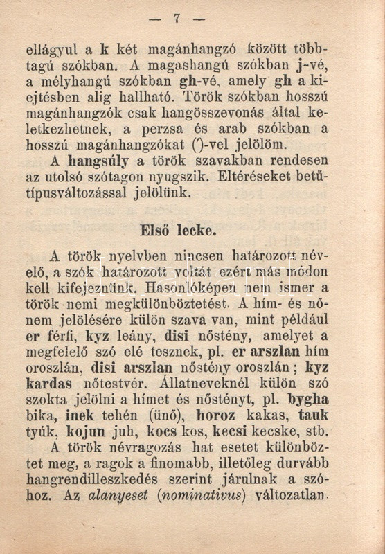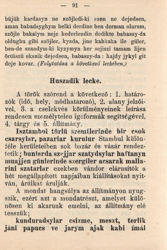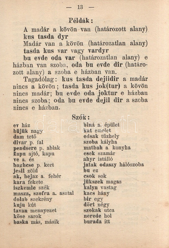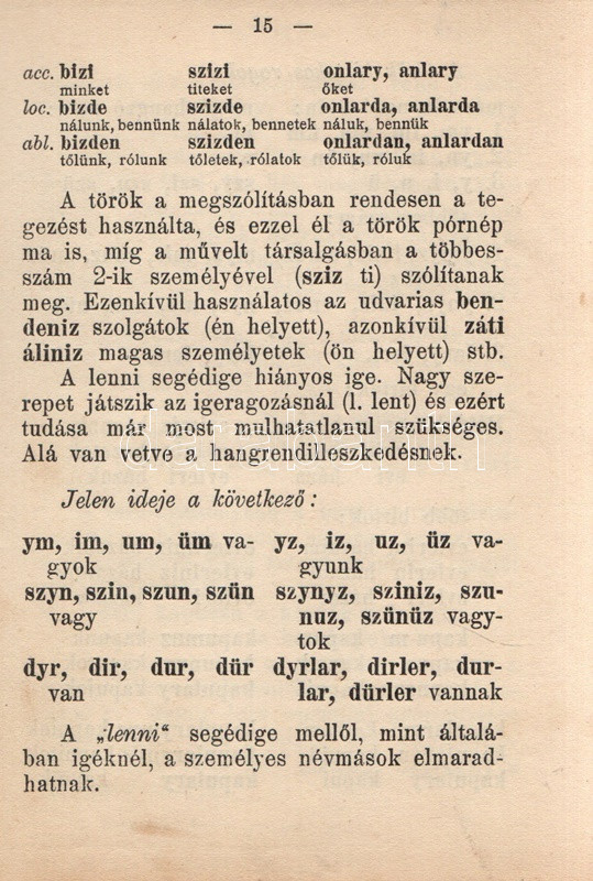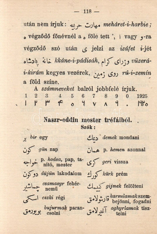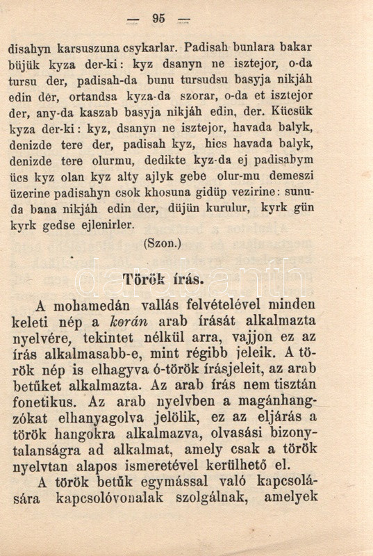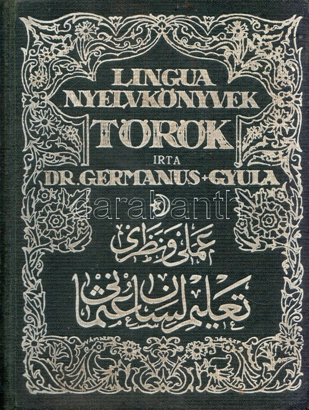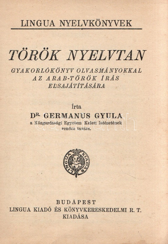 Germanus Gyula: Török nyelvtan. Gyakorlókönyv olvasmányokkal az arab-török írás elsajátítására. Budapest, [1925]. Lingua Kiadó és Könyvkereskedelmi Rt. (Hornyánszky Viktor ny.) 136 + [8] p. Egyetlen kiadás. Germanus Gyula (1884-1979) orientalista, arab nyelvész és kultúrtörténész, utazó, számos akadémia tagja. 1925-ben megjelent török nyelvkönyve az Atatürk-i török nyelvújítást éppen megélő nyelv tradicionális grammatikai rendszerét ismerteti. A közép-ázsiai altaji nyelvcsoportba tartozó, ragozó török nyelv az Oszmán Állam mérhetetlen hódításai révén rengeteg arab elemmel dúsult fel, írásrendszerének is felvette az eredendően nem a török nyelv számára fejlesztett arab írásrendszert. A 19. század során már erősen érezhető volt, hogy az arab írásrendszerű, és szókincsében igen erős perzsa és arab hatásokat mutató török nyelv túlságosan heterogénné vált, modernizálásra, egységesítésre szorul. Az első világháború végétől számos tudós dolgozott a reformon, nyelvkönyvünk kiadása után három évvel pedig örökre száműzték az arab írásrendszert: Törökország 1928 óta latin abc-t használ, arab és perzsa szókészletét pedig jelentős mértékben csökkentette. Illusztrált kiadói egészvászon kötésben. Jó példány.